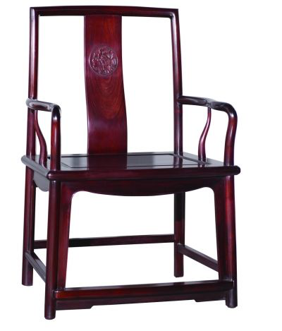 此椅搭脑中部削出斜坡,以便颈项倚靠。两端微微翘起,并略向后兜转,制作圆浑,给人舒适之感。靠背板独木无雕饰,向后弯曲,圆婉合度,至底部始有垂直之意。